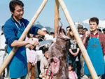 あんこう料理と言えば吊し切り、というほどあんこう料理と吊し切りは切っても切れない関係にあります。これは、あんこうが大きく柔らかいので、まな板の上ではさばきにくいために考えられた方法です。冬のあんこう鍋の最盛期には、市内の、温泉旅館・民宿等や食事処など、各所で「名物あんこうの吊し切り」が行われ、見学することもできます。